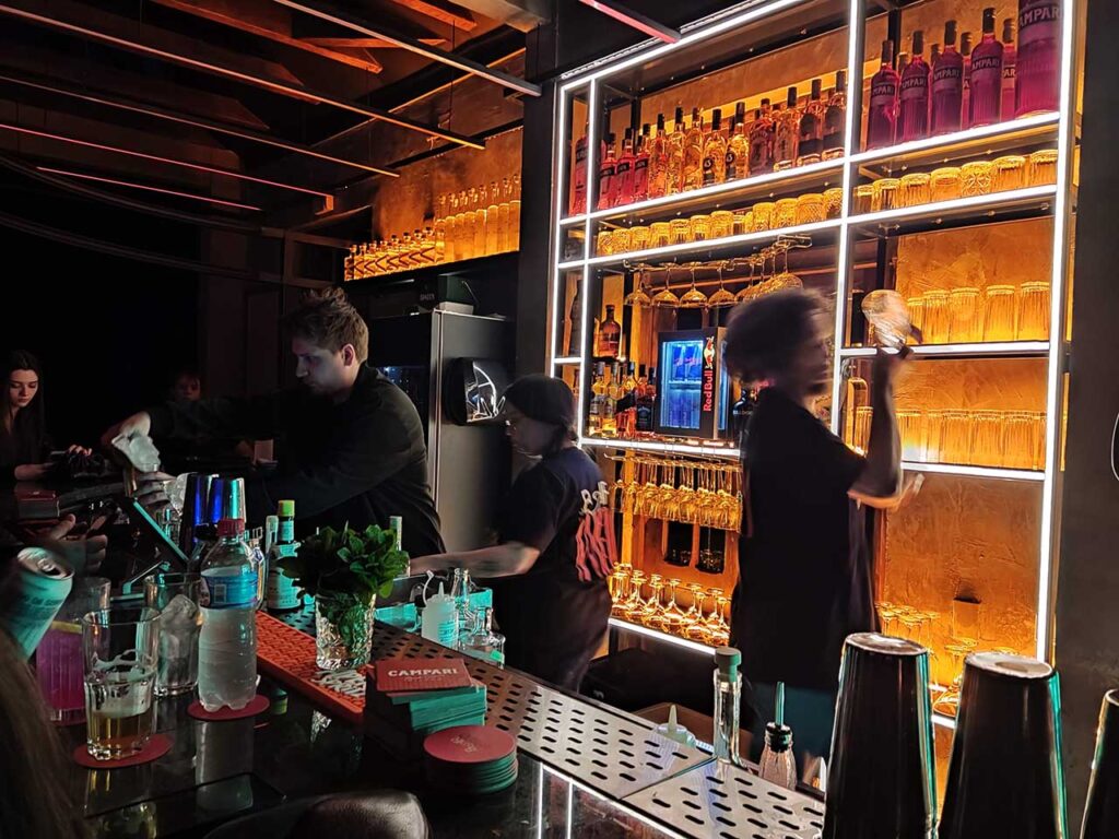 A área do bar também é dividida ao meio. Uma parte é o espaço do bar, com um balcão que vai de fora a fora, com bancos para poder aproveitar o balcão para beber e conversar, e também algumas mesas bistrô. A outra parte é separada por cortinas, que no início da noite dão um ar meio secreto ao ambiente – até o momento em que as cortinas são finalmente abertas, e é revelada a pista de dança.