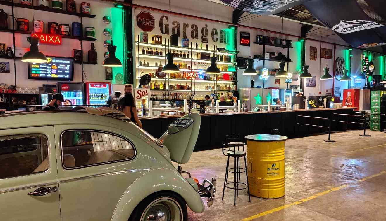 No teto, as bandeiras dos motoclubes ajudam a abafar o som dos clássicos do Rock que embalam as noites de quarta a sexta, e durante todo o dia nos finais de semana. Para beber, os clientes do Armazém Garagem podem optar por chopes variados ou drinks autorais preparados pela Mara.