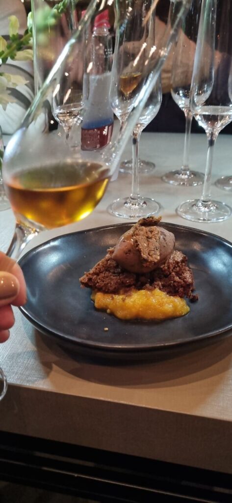 De sobremesa, um mousse de chocolate 70%, amêndoas, compota de tangerina, crocante de sementes e sorvete de chocolate trufado, harmonizado com tequila 1800 Milenio. Após um longo e estruturado processo de envelhecimento, esta tequila extra-añejo é amadurecida em barricas de carvalho francês, criando um sabor equilibrado, suave e requintado com notas de baunilha, frutas vermelhas e canela. Seu grande destaque é a finalização em barris de conhaque. Mais uma hamonização perfeita. Essa tequila é muito saborosa, o envelhecimento dá um toque muito diferente, lembrando até um bourbon.