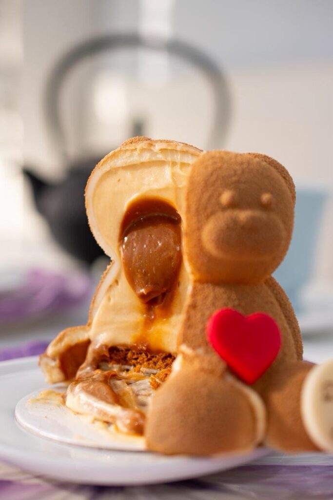 Entre as sobremesas mais procuradas da Délices de Sucre está o Ursinho Apaixonado, feito com base de bolacha Lótus, mousse de specullos e recheio de caramelo crocante, em formato de ursinho coberto por chocolate branco.
