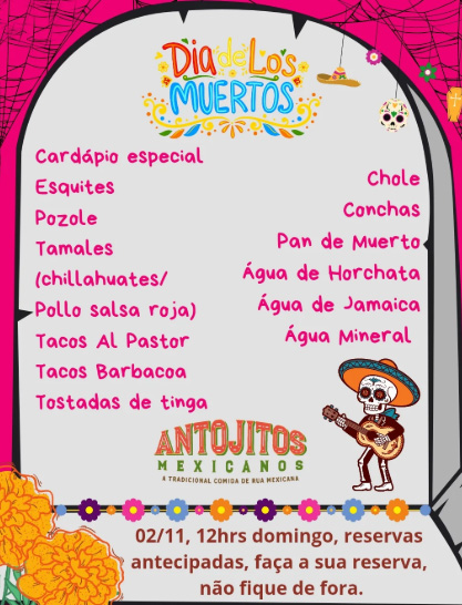Tem cardápio especial no Antojitos Mexicanos no dia 2 de novembro, no almoço. O cardápio está bem caprichado, inclui diversos pratos típicos mexicanos, e alguns deles você não encontra em qualquer lugar em Curitiba: Esquites, Pozole, Tamales, Tacos al pastor, Tacos barbacoa, Tostadas de tinga, Chole, Conchas, Pan de muerto, Água de jamaica, Água de horchata e Água mineral.