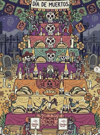 Nos dias 31/out e 1/nov o Pinches Tacos vai comemorar o Día de Muertos com decoração  temática com altar e cardápio especial, com pan de muerto e os típicos tacos de Guisado. Estes tacos são as preparações mais caseiras do dia a dia no México, e são parte das oferendas feitas nos altares a quem já se foi, já que costumam estar entre as comidas favoritas.