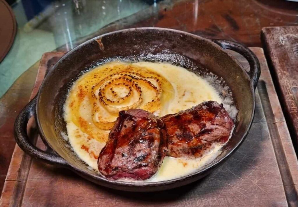 O ossobuco defumado é uma delícia, um prato que surpreende quando você descobre a técnica utilizada. A carne passa por defumação e depois é cozida até atingir o ponto ideal para desfiar. É prensada e volta ao osso – uma espécie de reconstrução do corte original. Acompanhado por purê de batata salsa e picles de cebola tostada, o prato tem um sabor intenso e textura cremosa.