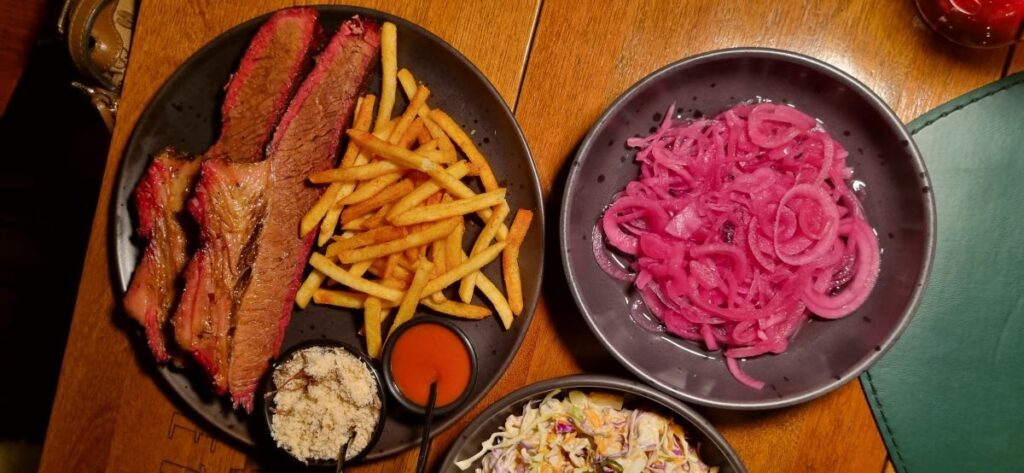 O cardápio reúne cortes clássicos como brisket e pork ribs com molho barbecue. As carnes também são servidas em sanduíches no pão brioche ou em baguete de fermentação natural, acompanhadas de molhos da casa e batatas temperadas com o Eagle Rub. Aliás, o sanduíche de Pastrami é imperdível. Uma combinação perfeita de carne saborosa, suculenta, picles e maionese artesanal. A cozinha ainda inclui hambúrgueres de fraldinha e cordeiro, além de opções como polenta frita e uma ótima salada coleslaw. Aos domingos, a casa oferece carnes por quilo, com opções que incluem brisket, pulled pork, costelas suína e bovina, cupim e frango.