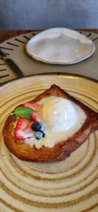 Fui provar o brunch recentemente. O menu é servido a la carte, ou seja, não tem valor fechado. A nossa refeição começou com a cestinha de pães quentinhos servida com manteiga noisette, requeijão e geleia artesanal. Salada de frutas com sorvete de coco ou iogurte com granola salgada são outras opções. A seguir, um prato imperdível: panelinha com ovos poché, emulsão de tucupi salgadinha e caviar. Uma combinação de sabor marcante que surpreende e encanta. As tartines no pão sourdough também são deliciosas, especialmente a que combina presunto parma, queijo de cabra cremoso, gorgonzola doce e figo fresco.
