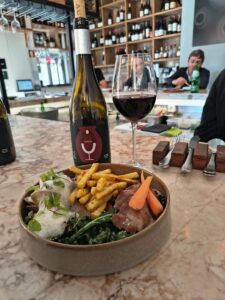 Para acompanhar, escolhi o tinto de talha Frade, elaborado com as castas Trincadeira e Aragonez. O vinho apresenta taninos presentes, porém macios, boa estrutura e excelente integração com o prato. Assim como o branco, é produzido pelo método ancestral em ânforas de barro, reforçando o compromisso da casa com as tradições do Alentejo.