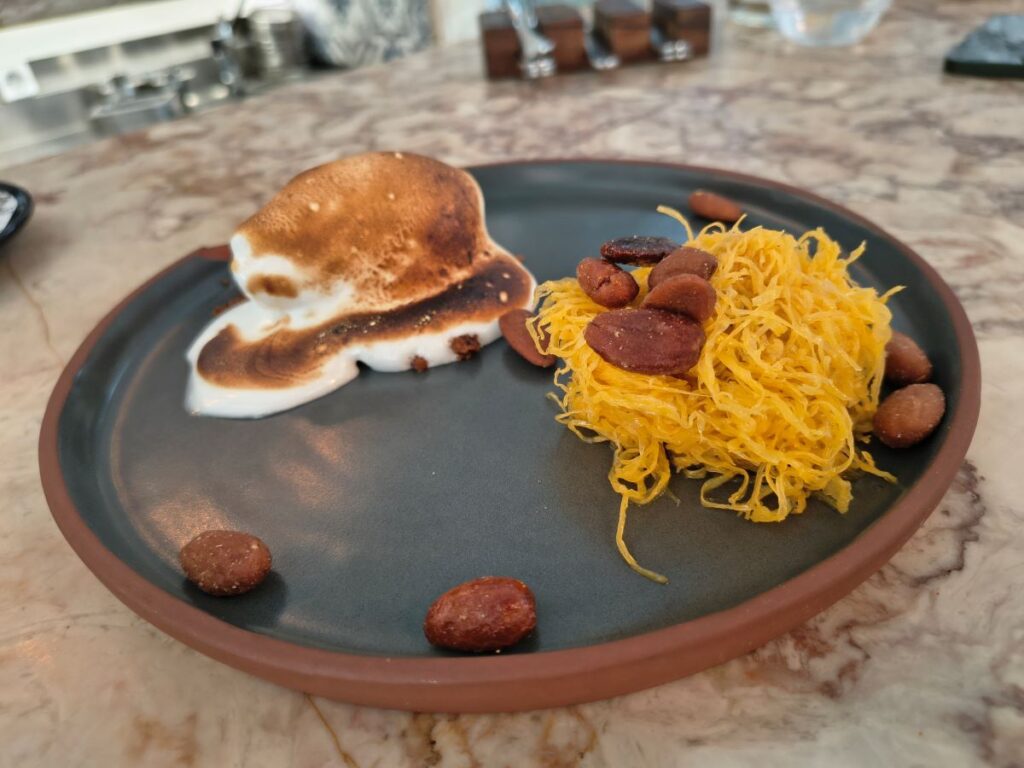 A versão apresentada no restaurante é elegante e contemporânea: crumble crocante, gelado de limão, merengue, fios de ovos com doce de amêndoas caramelizadas e amêndoas tostadas na finalização.