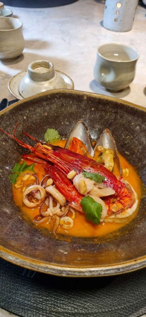 O prato principal é exuberante aos olhos e ao paladar. O curry vermelho tailandês, picante e cremoso, veio com lulas, mexilhões e um vistoso carabineiro, o camarão de alto mar vermelho e saboroso. Dando contraste ao prato, lichia (para adocicar) e amendoim (para crocância). Uma combinação que dá saudade só de lembrar.