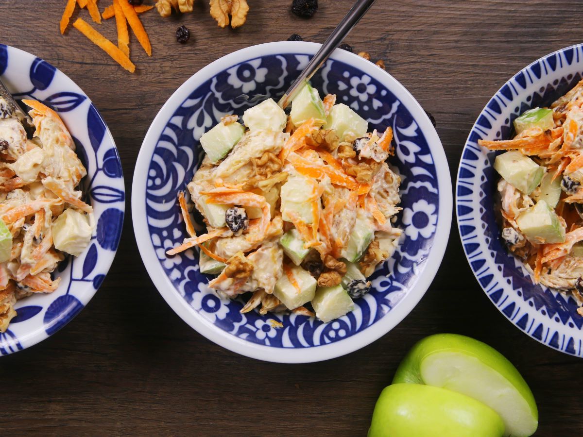 - Em uma tigela, junte o peito de frango desfiado, a cenoura ralada, as maças picadas, as uvas-passas, o milho e a azeite. Misture bem.
